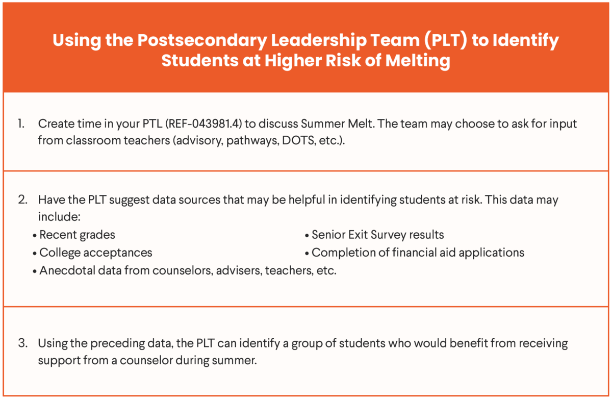 Summer melt occurs when high school seniors, who have successfully graduated and earned acceptance to a postsecondary institution, do not enter their chosen college in the fall. Counselors supporting the successful transition to college can optimize their effectiveness by working with students after graduation and identifying students at a greater risk of melting. In high school, students typically have a school counselor who supports them with college planning and the application process. However, after graduation, students are left to continue the process on their own. Obstacles such as extensive and time-consuming paperwork, family responsibilities, pressure not to attend college or leave home, fear and doubt, and limited college knowledge can influence a student’s choice to not attend. Since many students at your school may exhibit difficulties with transitioning, it is helpful to identify students at a higher risk of melting. These students will need a more intensive form of outreach/advising to ensure they transition to college. However, even students who appear to be in command of their college transition may need check-ins to ensure deadlines are met.