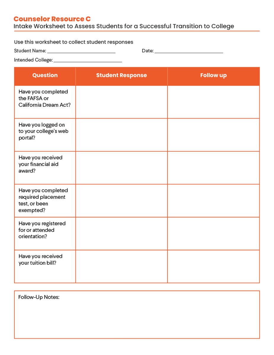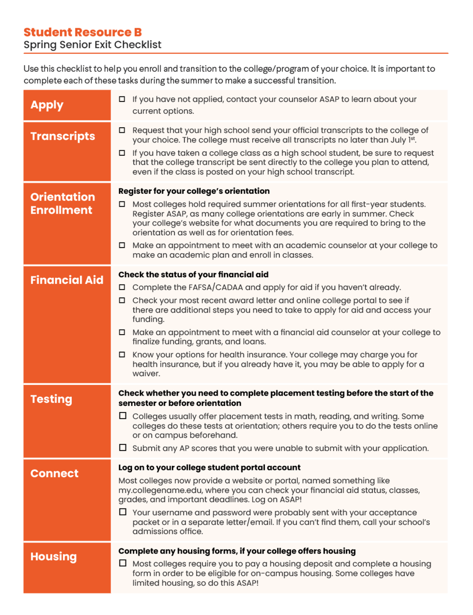 Checklist for students with more detailed information on steps students should take for a successful transition to college.