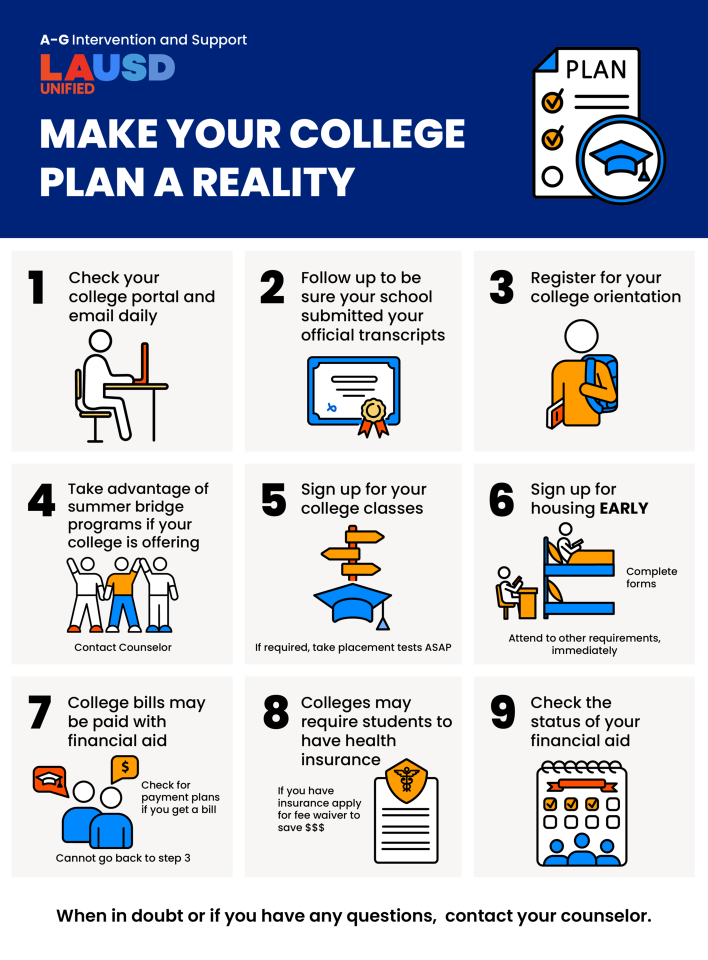 From signing up for summer bridge to registering for courses, navigating college can be quite daunting for a new college student. Particularly in the summer after senior year and during their first few months of college, students may need support getting through their college’s specific administrative processes. This section provides a brief overview of some of the key steps in the college enrollment and registration process.