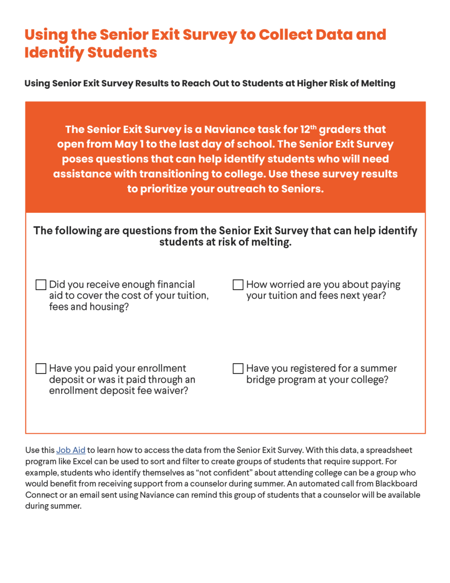 Use this Job Aid to learn how to access the data from the Senior Exit Survey. With this data, a spreadsheet program like Excel can be used to sort and filter to create groups of students that require support. For example, students who identify themselves as “not confident” about attending college can be a group who would benefit from receiving support from a counselor during summer. An automated call from Blackboard Connect or an email sent using Naviance can remind this group of students that a counselor will be available during summer.